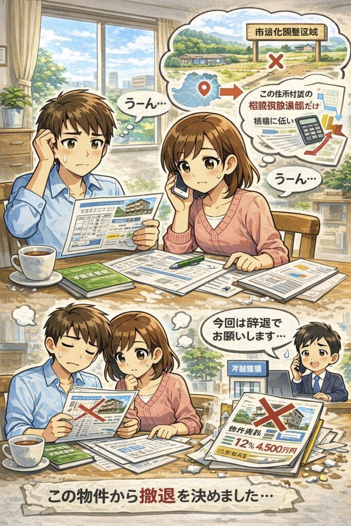 このため、この物件については、私たちの購入条件に合わないことから、撤退することに決め、不動産屋さんに断りの連絡を入れました。