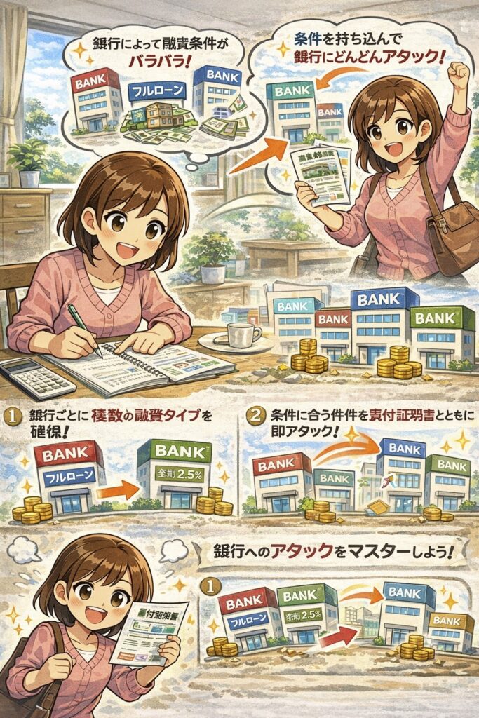 ・銀行ごとに内諾を受けられた融資のタイプを複数確保しておくこと