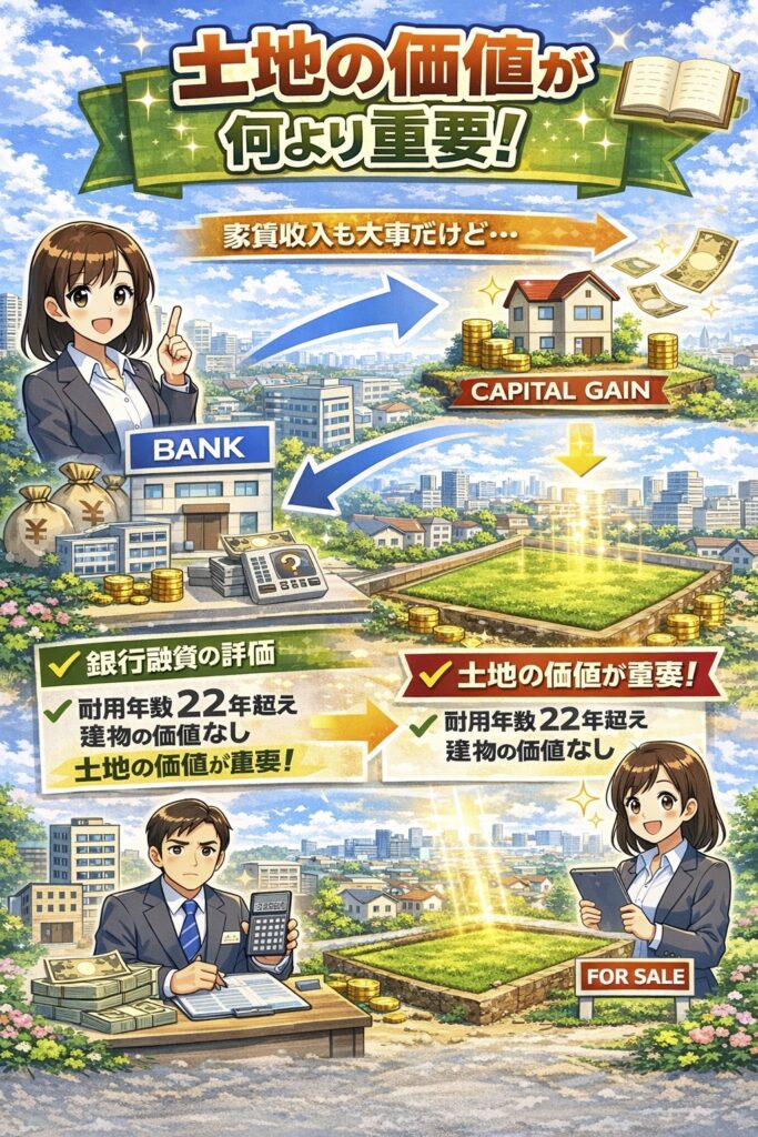 また、売却時にキャピタルゲインを大きく出すためには、同じく、耐用年数22年を超えた建物の価値はないため、土地の価値が全てとなってきます。