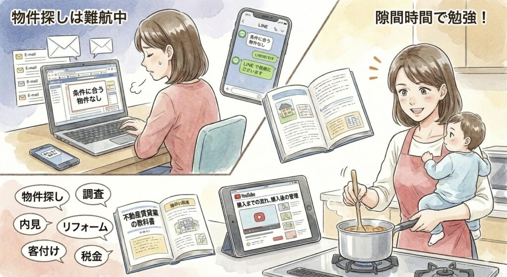 ・その代わり、育児や家事の隙間時間で、Youtubeや本で不動産賃貸業の勉強をしました。