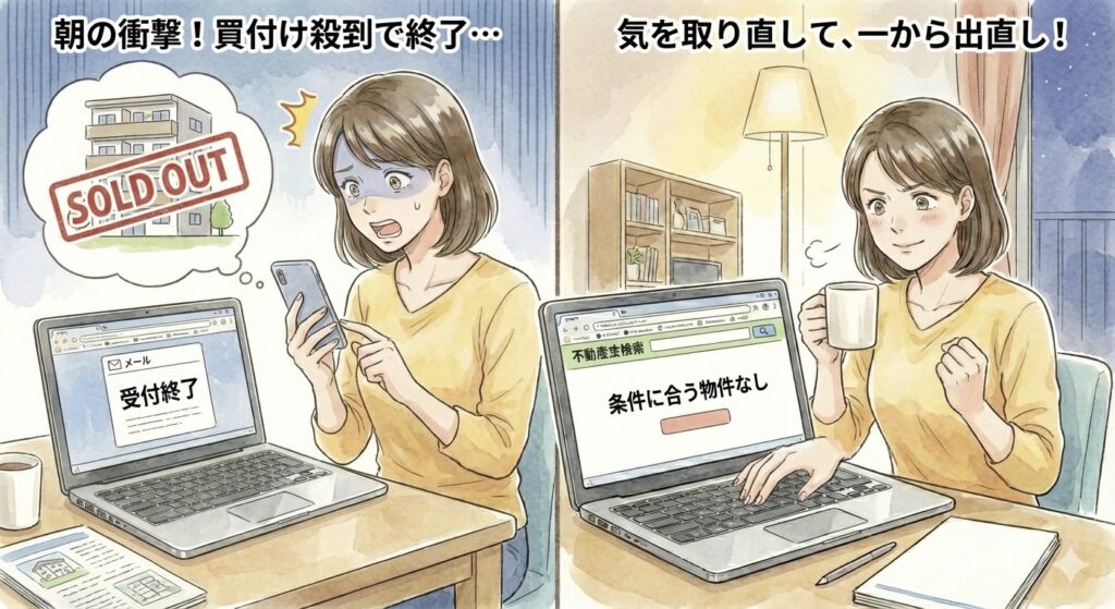 ・購入に向けて、朝から早速、取り扱っている不動産屋さんに問い合わせると、既に買付け殺到で、締め切ったとのこと